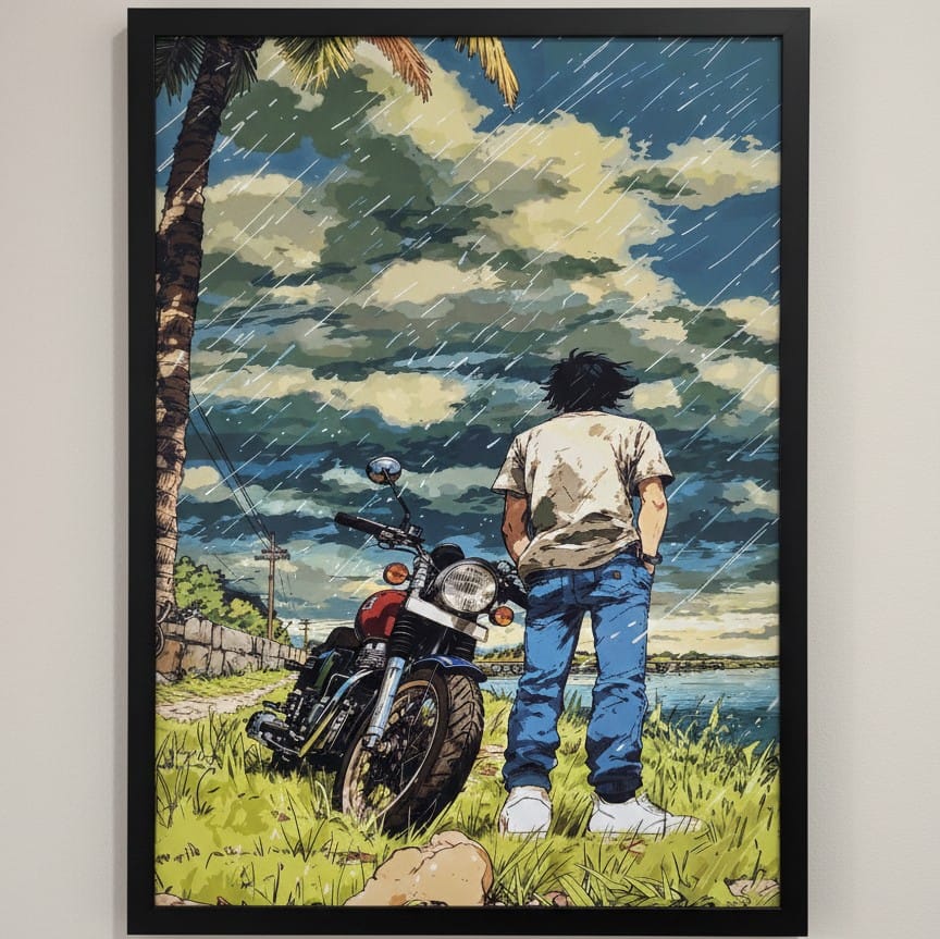 Capture a moment of quiet reflection with Rain & Reflections, a powerful wall art frame portraying a lone rider standing beside his motorcycle under a rainy sky. The blend of soft rain, open landscape, and solitude reflects freedom, emotion, and the deep connection between a traveler and the road.