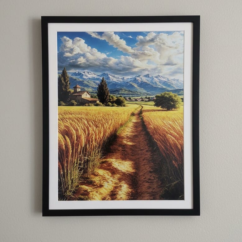 Step into a peaceful countryside scene with Golden Fields Journey, a beautiful nature wall art frame featuring a sunlit path winding through golden fields toward distant mountains and a quiet village. The soft light, open sky, and natural textures create a sense of warmth, simplicity, and timeless beauty.