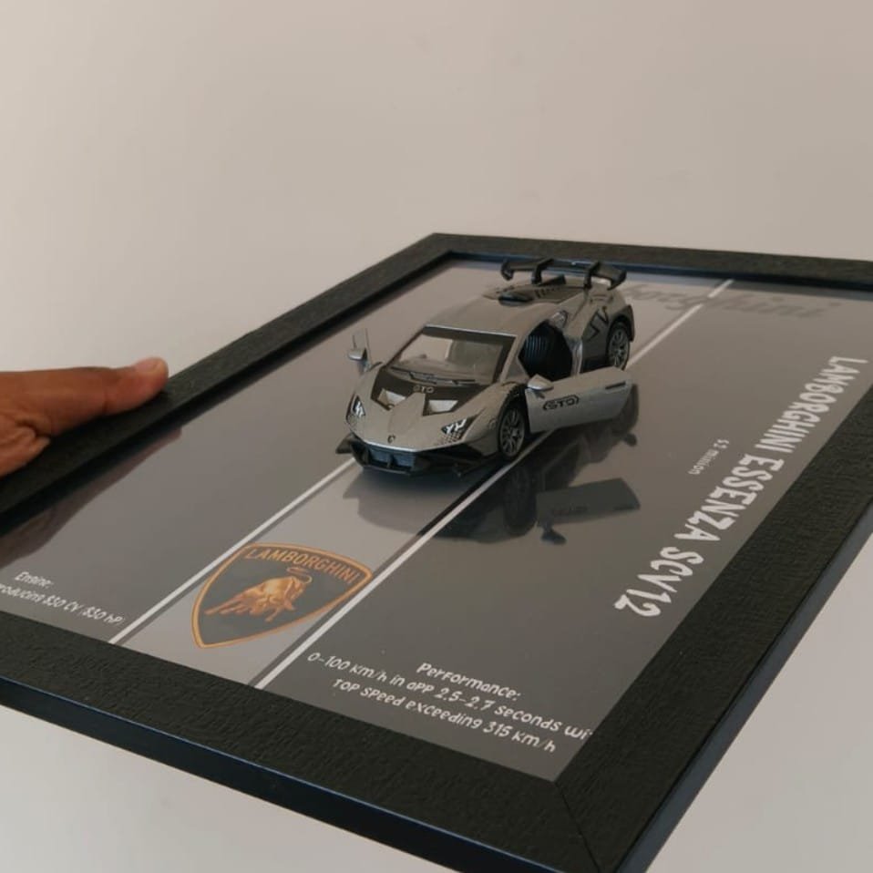 Bring supercar passion to your walls with this premium 3D Lamborghini Essenza SCV12 wall frame. Featuring a detailed die-cast miniature mounted on a sleek racing-inspired background, this frame creates a bold 3D pop-out effect that instantly elevates any space. The matte black frame, iconic Lamborghini branding, and performance details make it a must-have for car enthusiasts.