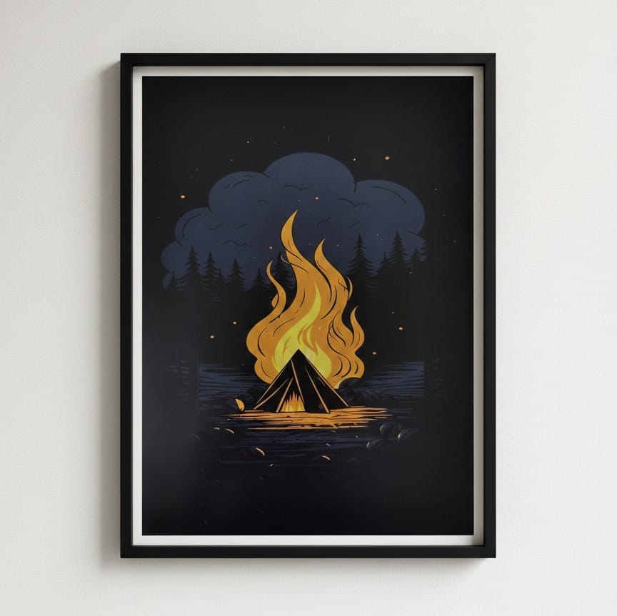 Bring warmth and calm to your space with the Midnight Campfire Nature Printed Frame. This artwork captures a glowing campfire set against a serene night forest, symbolizing peace, adventure, and connection with nature. The rich dark background paired with the golden flame creates a striking visual that enhances any room.