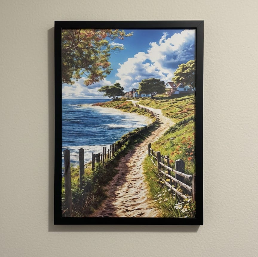 Bring home the peaceful charm of the coast with Coastal Serenity Path, a beautiful nature wall art frame featuring a winding pathway along the sea, bordered by lush greenery and gentle waves. The bright sky and distant cottages create a sense of relaxation, freedom, and slow living.