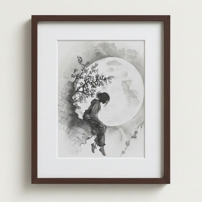 The sketch conveys calmness and solitude. The person appears lost in thought, reflecting on life under the quiet glow of the moon. The cracked wall and bare tree hint at past struggles, while the bright moon symbolizes hope, peace, and new beginnings.