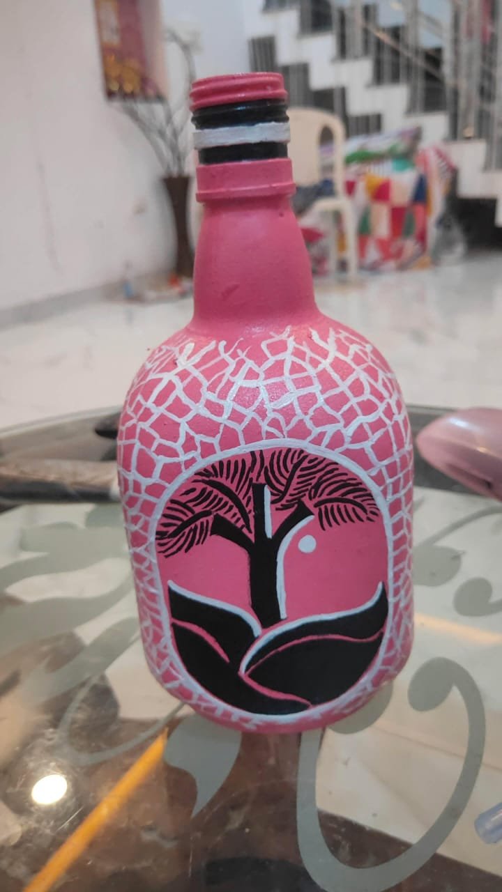 Add a touch of calm and creativity to your space with this hand-painted bottle art, featuring a graceful tree silhouette symbolizing life, growth, and peace. The soft pink base combined with bold black detailing and textured patterns gives this piece a modern yet artistic charm.