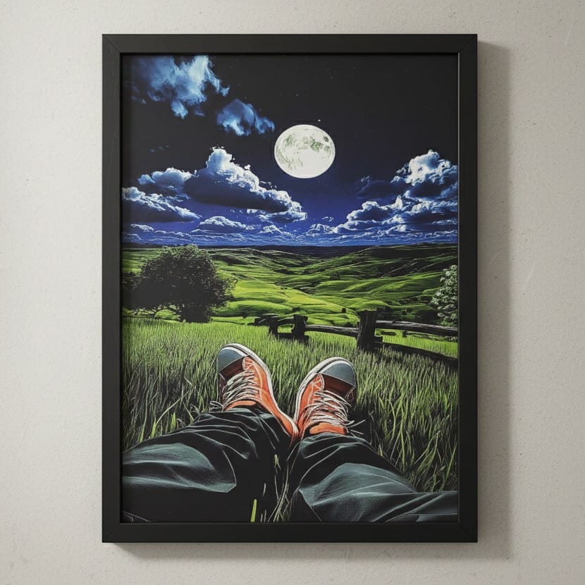 Relax and unwind with Under the Moonlight, a soothing nature wall art frame capturing a quiet moment beneath a glowing full moon. The artwork shows a peaceful grassy landscape under a dramatic night sky, inviting a sense of rest, reflection, and inner calm.